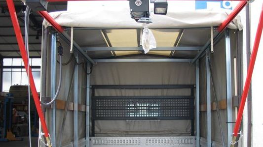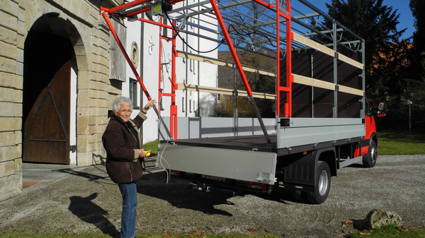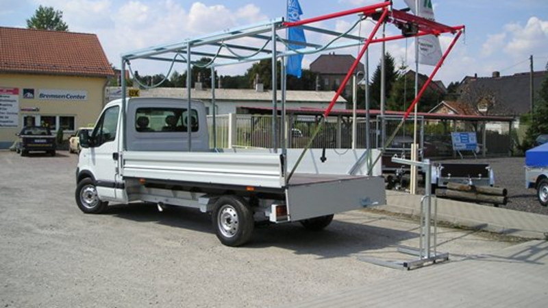 Auf besondere Kundenwünsche konstruierten und fertigten wir das Loading-Lift-System auch auf verschiedenen Pritschenfahrzeugen. Das Tragegerüst diente zugleich als Planenkonstruktion.