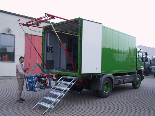 Der gesamte Stauraum im Container ist frei, und kann trotzdem mit den zusätzlichen über das Fahrzeugheck ausklappbaren Laufschienen in denen die Laufkatze in Längsrichtung verschoben werden kann, beladen werden.